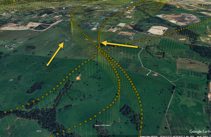 A close up of my practiced forced landing in Google Earth. The data came from my Arduino flight logger (click the image to learn more about it). The arrows show the target.