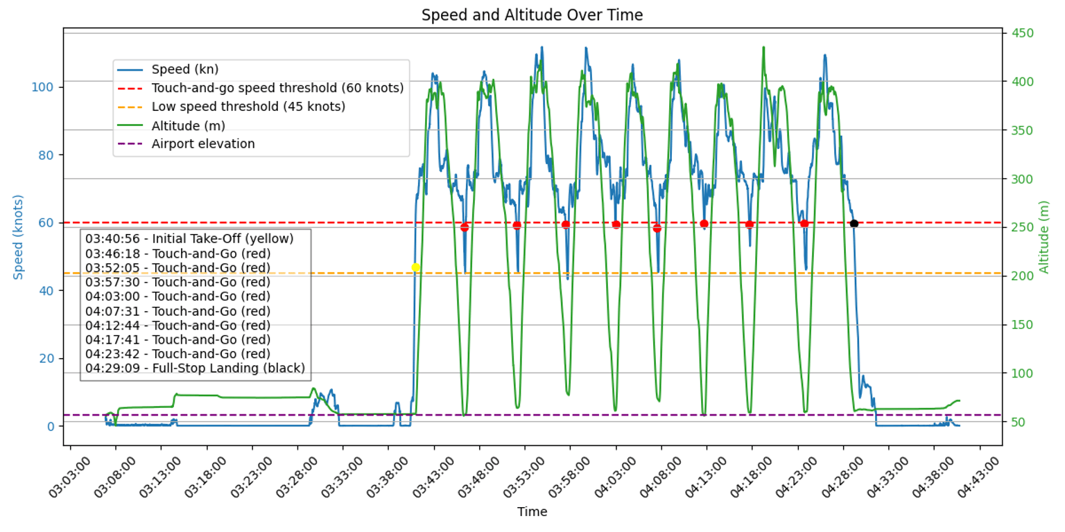 To develop this program, I spent a couple of hours with ChatGPT. Most of the time, I asked ChatGPT to create plots from the data, and with each iteration, the plot contained more analysis. For example, the first plot showed simply speed and altitude over time. The second added the two threshold speeds. The third contained a circuit for the takeoff, using both speed, altitude, and trend to increase from their lows within a few seconds.