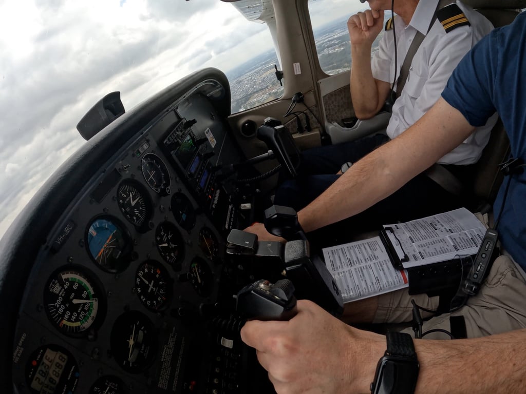 Runway 06, wind variable 5 kts, Occasional tail wind 3 kts, vis > 10km, Cloud Sct 1500, Bkn 3000, Temp 20, QNH 1020 Time of flight 0845 local Peter is progressing however he needs to focus on the following items: 1) Use of trim - You must first set the attitude, let the airspeed settle, then trim. Do not trim prior to setting attitude and airspeed 2) Airspeed - Two ket speeds for Peter to remember, 75 kts on base and 70 kts on final. We use attitude to adjust airspeed and power to adjust rate of descent 3) Power - Power must be reduced when leveling off a climb via the ASPT method. Attitude, Speed, Power, Trim. You must allow time for the airspeed to settle once you change attitude. Remember to use trim to hold the attitude not to obtain the attitude. Peter is having trouble remembering, if too fast, then raise the nose, too slow then lower the nose. Power is not the answer, however some power adjustment may be required depending upon the situation. I have also notice Peters grip on the control column is like a "death grip". I encourage Peter to hold the controls lightly.