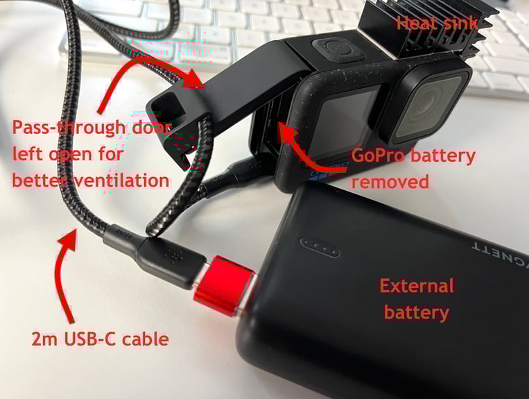 How to extend GoPro recording time: remove internal battery, use external battery, attach heat sink.