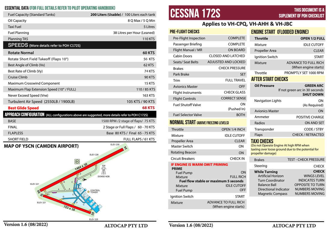 For the Cessna 172S, I am using the checklist that you can see below. This checklist is compiled by Flight school. Apart from the standard items that you'd expect to see, there's also a handy map of Camden Airport.