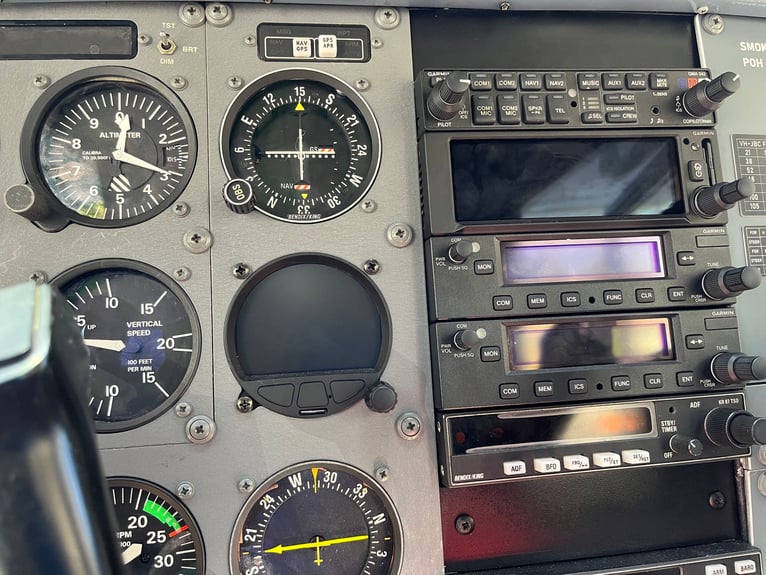 Some of the "glass" gauges on the left, and the avionics (two radios), a GPS unit, a transponder, and a collision avoidance unit on the right side.