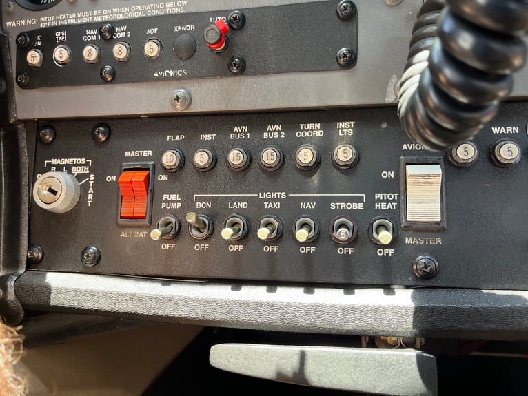 A view of the cockpit. You can see the red electrical systems master switch. On its left is the magnetos switch (this helps start the engine). There's the row of light switches, and on top of it the row of fuses. To the right of the light switches is the avionics master switch.