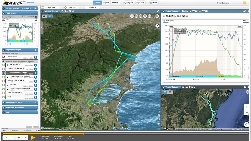 Eventually, conditions stabilized enough that we felt confident about flying part of the route: Camden to Shellharbour and back. Not the full triangle, but still an excellent chance to log time and practice navigation, radio work, and circuits.
