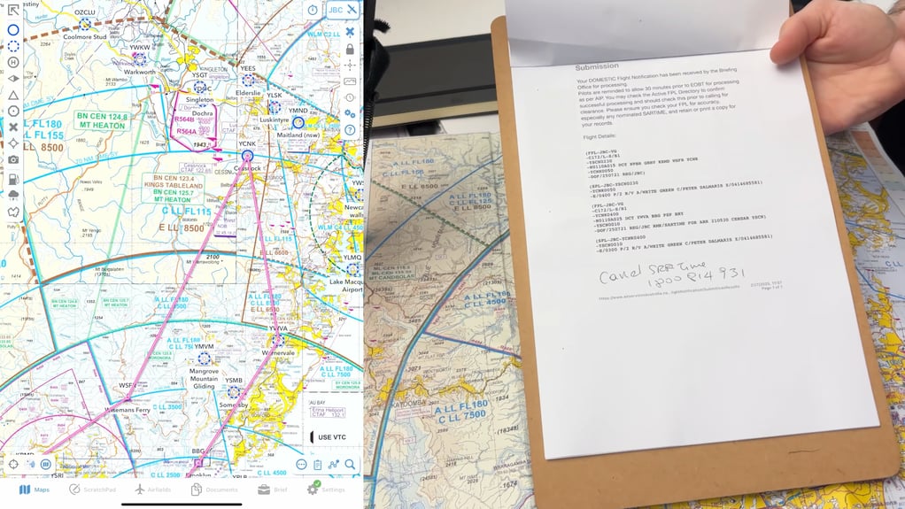 On the morning of the flight, cloud cover over the mountains made the original plan unsuitable. I contacted the Bureau of Meteorology for an update, but conditions were not expected to improve until much later. I made a last-minute change and re-planned for a northern route to Cessnock, where I had previously done some RPL training. This was a practical lesson in flexibility and real-world aeronautical decision-making.