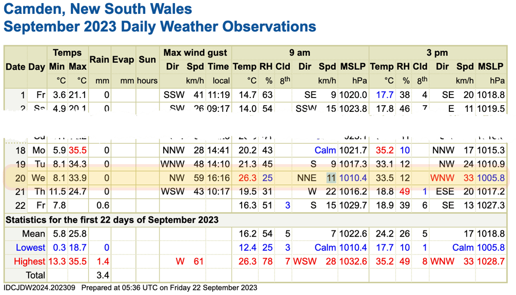 The BOM provides historical data of their forecasts and observations, and (below) you can see that on September 20, gust winds were up to 59 Km/h (31 kt).