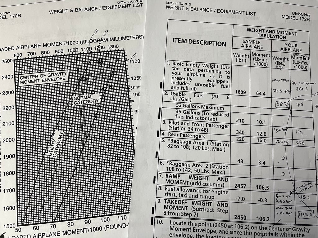 In the photo below, you can see what the weight and balance worksheet looks like for the Cessna, with my siblings on it: